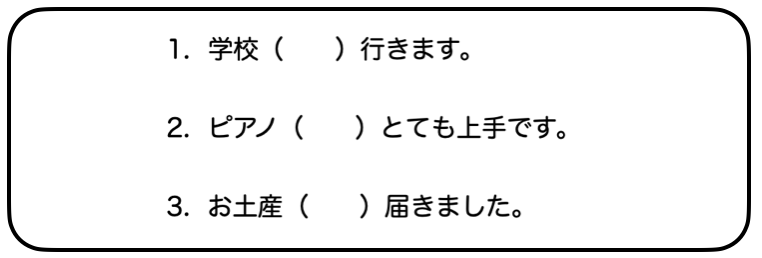 穴埋め 穴埋め 2025.08.29 穴埋め課題は、前後の言葉がヒントになるため、比較的想起しやすい課題です。 助詞の穴埋め 2語文 選択肢なし 文自体はシンプルですが、助詞の選択肢がないため少し難易度は高めです。 1ページ10問 絵の説明 質問の穴埋め 絵についての質問に答えていきます。 1ページ5問 随時更新していきます。